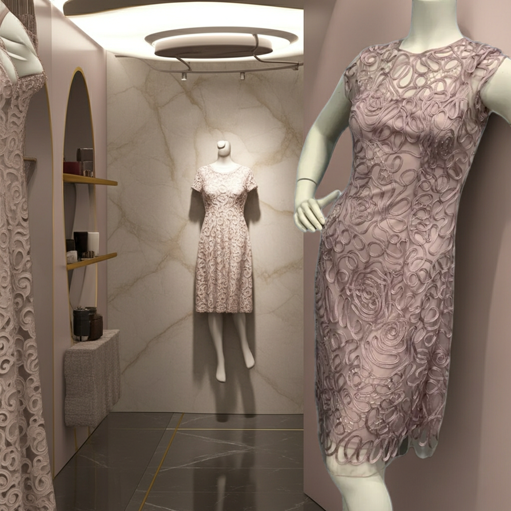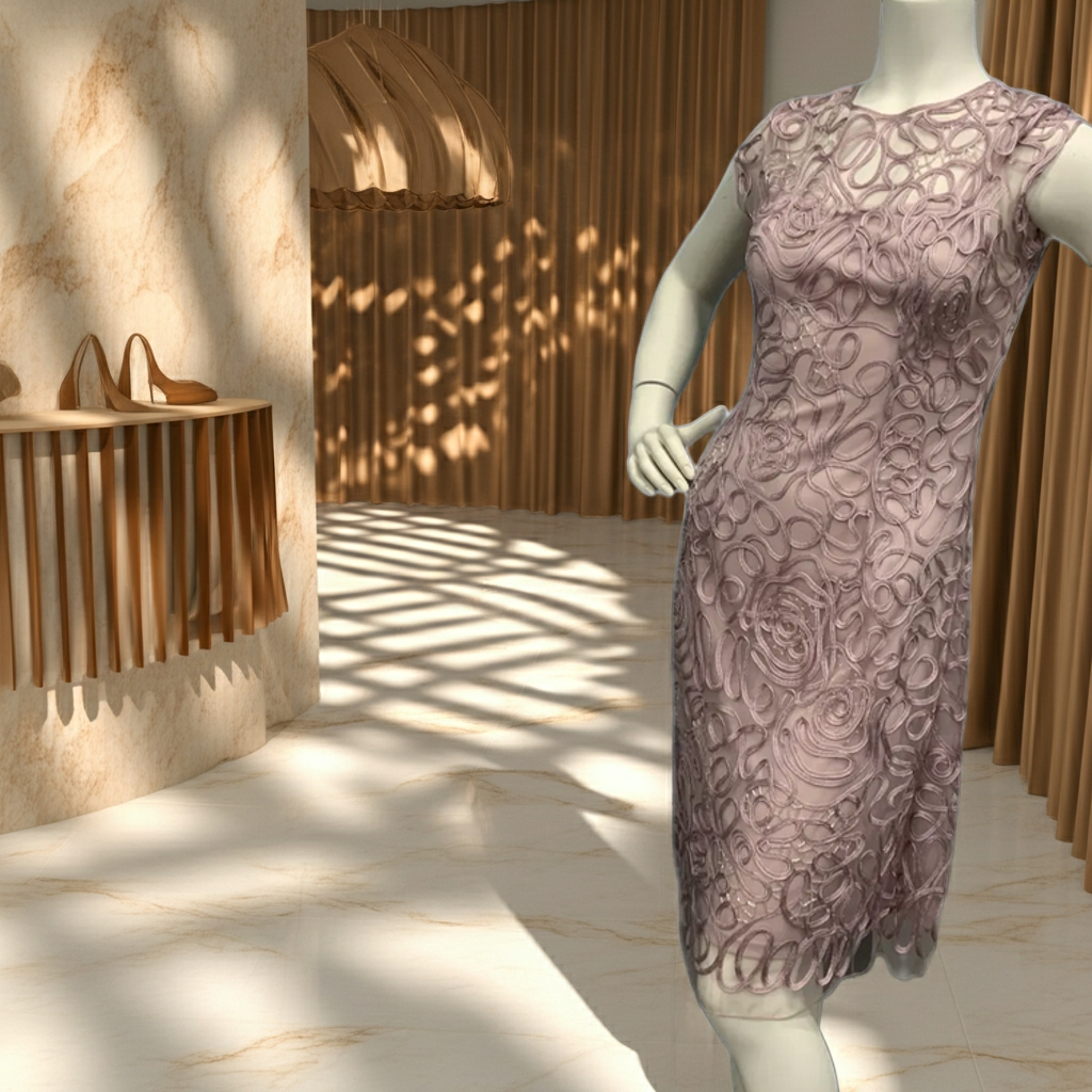 Het ontwerp heeft een ronde halslijn, een mouwloze snit met korte kapmouwtjes-effect, en een blinde ritssluiting aan de achterkant. De lengte valt net rond de knie, wat deze jurk bijzonder geschikt maakt als cocktailjurk, galajurk of avondjurk voor een bruiloftsgast.